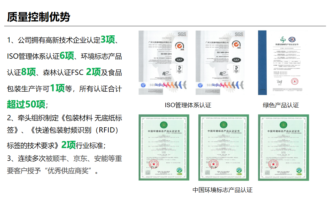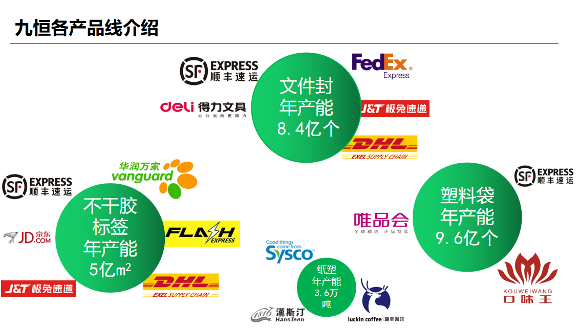 產(chǎn)品涵蓋電子面單、快遞運(yùn)單及快遞包裝材料等全系列快遞物流應(yīng)用材料產(chǎn)品,生產(chǎn)規(guī)模和綜合實(shí)力在行業(yè)內(nèi)處于前列,也是行業(yè)內(nèi)少數(shù)實(shí)現(xiàn)產(chǎn)業(yè)鏈延伸、提供全系列快遞物流應(yīng)用材料產(chǎn)品及綜合服務(wù)的企業(yè)之一。目前公司憑借應(yīng)用技術(shù)及產(chǎn)品創(chuàng)新優(yōu)勢,產(chǎn)品線向金融、醫(yī)藥、家用電器、環(huán)保紙塑等行業(yè)拓展,形成品類豐富的產(chǎn)品體系,產(chǎn)品市場占有率高達(dá)40%,涵蓋京東、順豐、郵政等2000多家知名企業(yè)。
